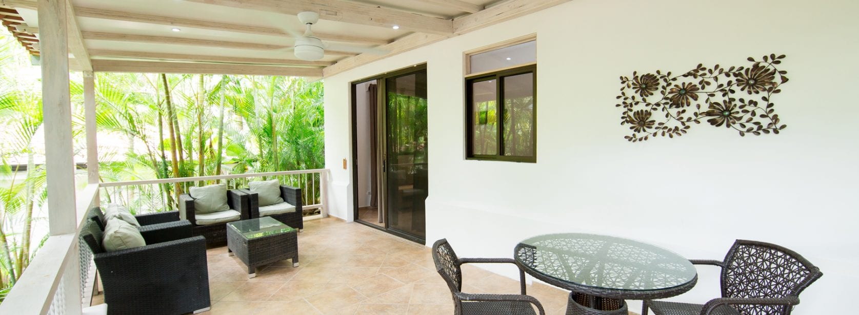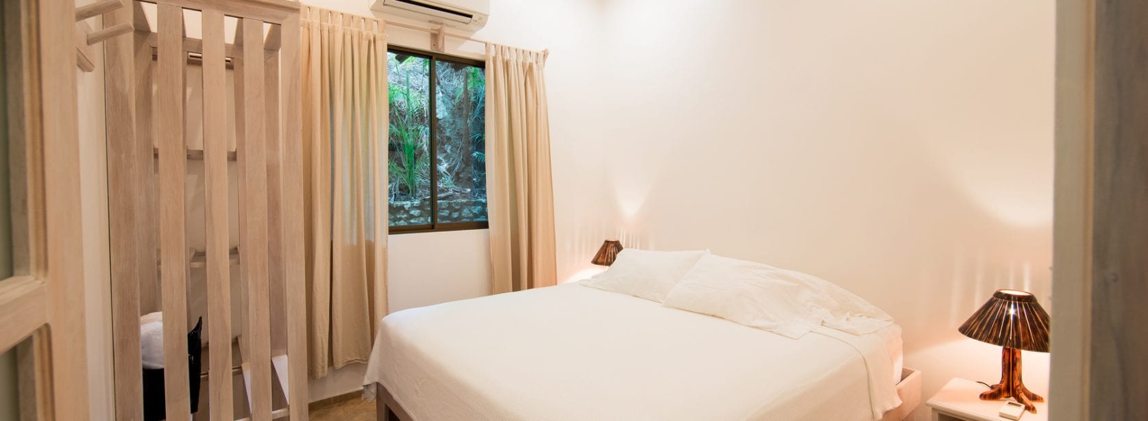 This room includes a queen bed, luxurious bathroom, air conditioning, wifi and a shared balcony with a jungle view.